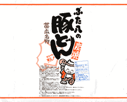 豚どん,1100円,2001.8.19購入 ★包装紙になにやら細かい説明が書かれている。この時点で失格。弁当を食べる前に説明書きを読む人などこの世の中にどれくらいいるだろうか(ちなみに私はきちんと読む性格だが)。つまり,ヒモを引っ張ると容器の底に入っている発熱体が発熱してアツアツの弁当が食べられるということが書いてあるのだが,それを知らずに食べてしまう人がけっこういると思う。実際見たことがある。知らないで食べてしまった人にとっては単に上げ底をした詐欺弁当である。 |