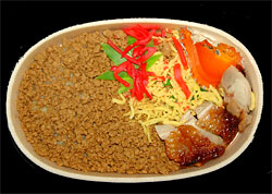 鳥親子弁当,800円,2002.8.30購入 ★★安くてなかなかボリュームがある。ご飯は普通の白米でパサパサしていた。 |