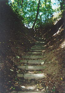 上ノ国八幡宮脇の遊歩道を登って行くと,随所に遺構を見ることができる。勝山館は夷王山山麓に築かれた山城で,武田信広が1457年コシャマインの戦いで勝利をおさめた後,築かれたとされている。勝山館は大館(松前)の副城的性格を持ち,1600年代初頭まで城代が置かれ,北方日本海側の軍事・交易の中心として栄えた。昭和52年の史跡指定後,発掘調査が行われ,遺構の復元が行われている。絶景。(2000.8訪問)