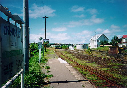 駅舎は1991年に建てかえられた商工会の建物で,観光案内所を併設している(何もない)。ホームは片側使用だが,向かい側の2番ホームも良く残っている。写真奥には建設中の給水塔が見えているが,SLを走らせる計画でもあるのだろうか。上ノ国は北海道で最も早く和人が住みついたところで,15世紀中頃には集落が形成されていたとされる。その割りにこれまであまり注目されていなかったが,近年,北海道随一の歴史を生かした観光地づくりが進められている。