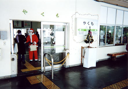 八雲は人口1万7千人を有する大きな町。駅は町の規模以上に大きく,それは八雲−江差間にバスが運行されており,桧山地方の人たちの足を一手に担っているからだ。特急もほとんどの便が停車する。上の写真はクリスマスイブの日,駅員がサンタクロースに扮してプレゼントを配っているところ。なかなかやる気の感じられる駅だ。