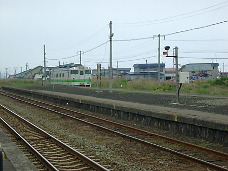 鷲ノ巣から線路は単線になる。この先長万部まで部分的に単線区間が残っている。鷲ノ巣を出ると国道をくぐって海側に出る。真北を向いて山崎へ向かう。途中右手に新幹線「新八雲駅」の看板が建っている。北海道新幹線はこの先,長万部駅,倶知安駅,新小樽駅を経由して札幌駅に至る予定だ。