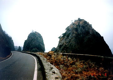 文学碑公園から先は,徐々に道が険しくなり海岸には奇岩が連なる。岩手県宮古の浄土ヶ浜に少し似ているが,浄土ヶ浜が天国の風景だとすれば,礼文華は地獄に見える。この道路は国道37号の旧道にあたり,写真右手の荒れた路盤が室蘭本線の旧線跡である。少し怖いが,辛抱して前へ進めば,礼文駅のある礼文華の集落に出ることができる。