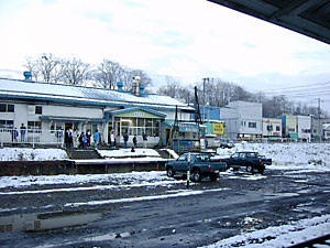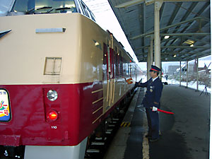 | 駅前の占山亭で昼飯を食べて外に出ると,駅前がやけに賑わっていた。ホームに行くと,ツアーの列車が到着していた。 | |