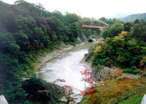 ここから北海道の鉄道車窓風景の中でも特に素晴らしい区間に入る。列車はまもなく夕張川を渡る。ここでは川端ダムに堰き止められた水を満々と湛えている。南側には旧橋脚も見えるが,この暴れ川を渡るのには大変な苦労があったことだろう。2kmほど走ると再び夕張川を渡る。先ほどとは対照的にそこは既に竜仙峡といわれる渓谷に入っており,切り立った崖の底に夕張川は恐ろしい表情を見せている。右手には渓谷が続き,吊り橋も見える。辺りは公園として整備されており,北海道有数の紅葉の名所となっている。国道を走る車からは見えないので,列車の乗客はちょっと得した気分を味わえる。