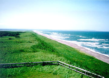北浜から引き続き,原生花園の砂丘に沿って走る。右手には国道が沿い,その向こうに涛沸湖が横たわっている。途中にドサンコのたわむれる「展望牧舎」があり,観光客の姿も見える。左の丘陵上に白いピラミッドの「フトレイ展望台」が見えてくると,まもなく浜小清水到着。これまでの人の臭いを感じさせない車窓から一転して,俗っぽい雰囲気になる。