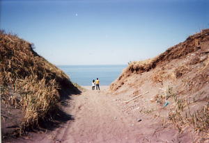 砂丘に阻まれて海は見えないが,一部砂丘が途切れていてそこから海に出ることができる。砂浜は気持ちがいい。