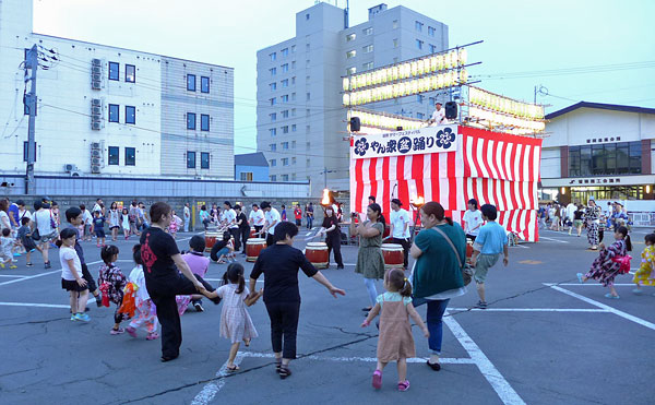 盆踊りは一時期下火になったというが、2012年にやん衆盆踊りとして新たに市を挙げての盆踊りが開催されるようになり、この年は2回目の開催である。会場は留萌駅から西に約1km弱、1960年代に人口4万を数えた全盛期の留萌の面影を残す古い市街地にある産業会館前の広場である。