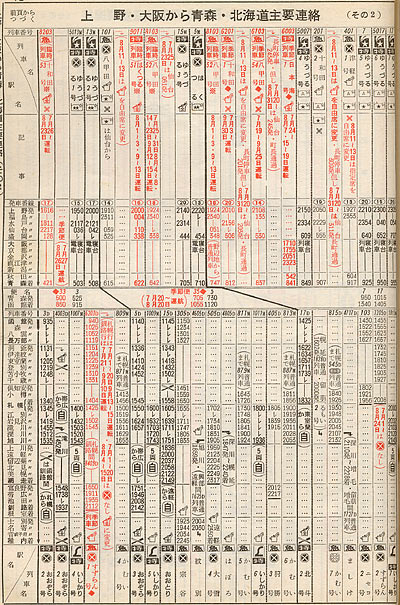 北海道〜本州を鉄道で移動するのがまだそれほど特殊ではなかった頃。東北の夜行列車の多さに驚く。この中で現在も名前が残るのは「日本海」のみである。ここに掲載されているのは一部で,さらに青森到着が10時〜11時台となる列車が何本かあった。