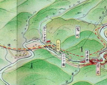 中央からニニウに向かうとき市街を出るとすぐに鵡川を渡る。今は立派な占冠橋が架かっているのだが,ここに橋ができたのは昭和29年7月10日でそれまでは渡船だった。占冠に3つあった渡船場のうち最も遅くまで残ったものである。普段は舟底を川にこすりつけながら人馬を渡したが,いったん雨が降ると急速に水量が増加するので,渡すのも渡されるのも命がけということも多かった。ニニウと中央の間には鬼峠ともう一つ渡し舟という難所があったわけである。