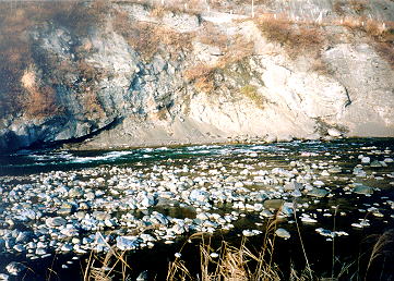 現在ニニウを通る道道は鵡川の北に沿っているが,かつては途中の断崖絶壁(右の写真)を避けるため,2本のつり橋で鵡川を渡っていた。およそ殖民区画の2号に沿ってかけられ「ニニウ1号橋」,「ニニウ2号橋」を名乗っていた。両橋とも王子製紙の私有物だった。