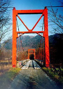 | キャンプ場にアクセスするつり橋。手前がキャンプ場。もともとは生活道路でかなり古いが,赤い橋はニニウの緑に映え,今ではニニウ自然の国のシンボルである。重量制限はたしか1.5tで,車も渡れるが,橋げたは木なので少し恐い。 |