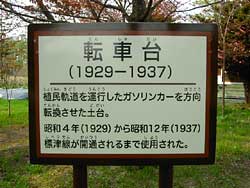 小さいが趣きある神社。境内に看板が見えたので行ってみると昔の殖民軌道の転車台だという。わずか9年しか使われなかったのに良く残っていたものだ。