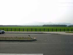 武佐から川北に向かう途中。牧場の向こうに斜里岳,海別岳を望む。内容は忘れてしまったが,このパーキングができたいきさつには,感動的な物語があったはず。
