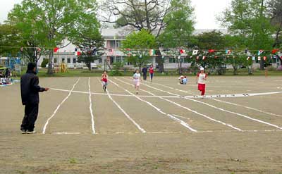 この校長先生,白のジャケット姿がいかにも山の学校の校長先生という感じがして好ましい。しかし,赴任してから今年で3年目,過去の2回の運動会はいずれも雨に見舞われ,「雨ふり校長」と呼ばれているそうである。