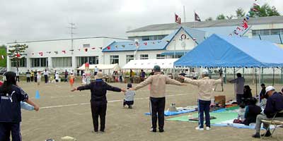 みんなでラジオ体操。おじさんおばさんがたは動きがばらばら。