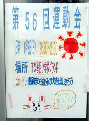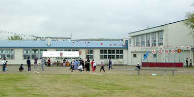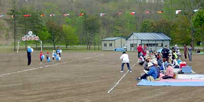 この学校ではプログラムをもらうことができた。それによると,児童は7名。1,2年生がいないのが寂しい。種目は23あり,出場者は「全校」「他校生」「保育園」「幼児」「老人」「一般」「女性」「来賓」「役員・先生」などで,まさに地域全員参加の運動会だ。