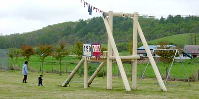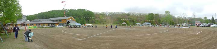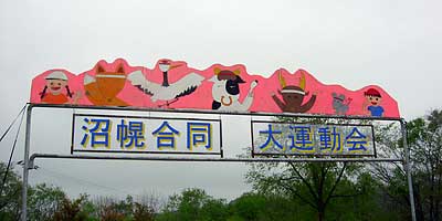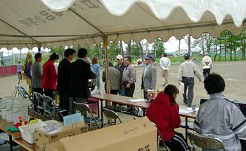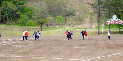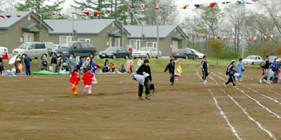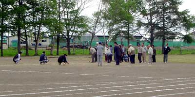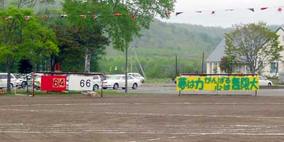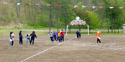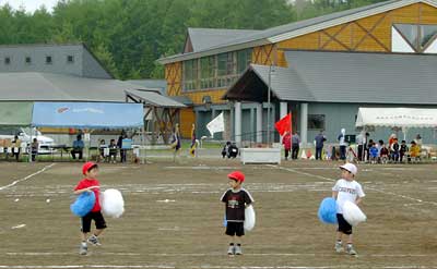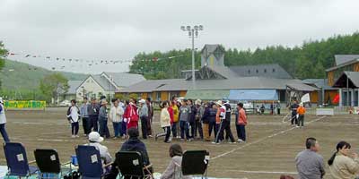 ついに登場,小さな学校ならではの地域住民参加の競技。人数が集まらないようで,「オンナタンナイ,あと3人!」,我は観戦と決め込んでいたおばさんも「オイ,レーコ,ナステンダー,早く早く」とせかされて腰を上げる。その後さらに「あと男性5人お願いします」と私も危うく駆り出されそうになったので,そっと木陰に引っ込む。