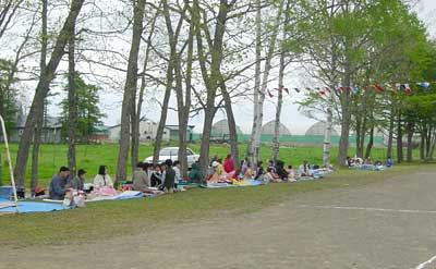 観客は木の下に陣取る。この規模の学校なら席取りの心配はまったく要らない。