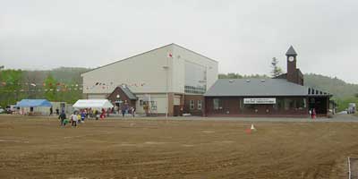 午前中の種目がちょうど終わったところで,雨が降り出した。「体育館でストーブを焚いてますので中へお入りください」とのアナウンスがあり,みな弁当を持って移動する。