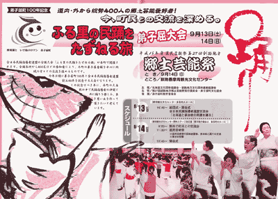 プログラムのようなものはありませんかと尋ねてみたら,「ふる里の民踊をたずねる旅」のほうは当然のごとく用意していないようで,後半の道民芸術祭のプログラムがあるのかどうかを別の担当者に聞いてもらえたが,関係者に配る分だけで,特にプログラムは用意していないとのこと。参考までにということで,↓のチラシをもらった。