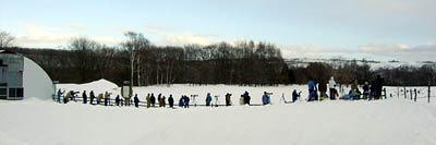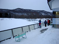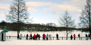 カメラマンが列を作る。観光バスも多く立ち寄り,いちばん活気のあるタンチョウスポットである。ここはもともと下雪裡小学校のあった場所で,先生と子供たちが給餌活動を始め,小学校の廃校後は渡部トメさんが給餌を引き継いでいる。渡部トメさんは紅白歌合戦の審査員になったり,NHKの方言の番組に出たりと大変有名な方である。