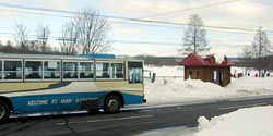 川湯温泉からの路線バスが鶴見台の停留所に到着。2名の観光客が降りた。バスの塗装もタンチョウをデザインしている。