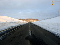 再び国道274号。歩道まできれいに除雪されている。こういうめったに通る車のない道の除雪に労力を注ぐなら,もっと住宅街の除雪をきちんとしてもらいたいものだが,そこはやはり役所,開発は国道しか,土現は道道しか,役場は町道しか除雪しないのである。