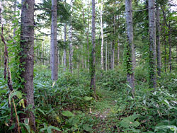 遊歩道は笹が刈られて,大変歩きやすかった。ただ,白樺遊歩道といっても,もはやシラカバの木はほとんどなく,大方エゾマツやトドマツに遷移していた。