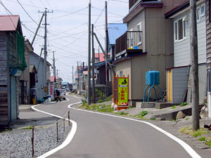 香深から知床への道路は観光コースから外れるためか,素朴な漁村の風景が見られた。こんな道でも路線バスが通っている。途中にSさんいわく「礼文でいちばん立派なバス停」があったが,写真に撮り逃した。