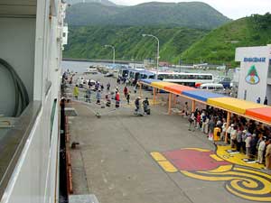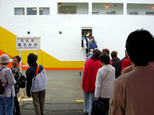フェリーから降りた人の多くはターミナルに入る間もなく観光バスへ乗り込む。