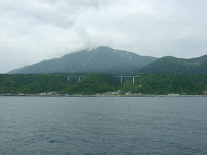 島に近づいてきた。利尻富士も何とか見えている。山麓の立派な橋梁に驚いたが,これは自転車専用道路なのだそうだ。
