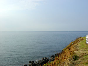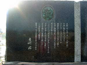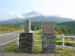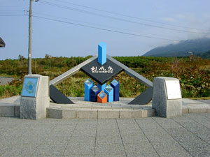 | ラナルド・マクドナルド上陸記念碑。1848年,アメリカの捕鯨船プリスマ号乗組員だったマクドナルドは日本入国を目的として降船し,ひとり小船で野塚に漂着した。本泊の運上屋で1ヶ月間の取調べを受けたあと長崎に送られ,そこで日本人に初めて英語を教えた。これによって英会話に習熟した者たちが列強との交渉に貢献し,日本を滅亡の危機から救ったのである。 | 土現が設置したモニュメント。記念写真を撮るには良い。 |