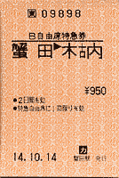 | 蟹田駅に函館行きはつかり41号が到着。この車両は蟹田まで乗ってきた485系特急車両を改造したものだが,シートも取り替えられ,快適性が格段に向上している。ダイヤ改正後も「白鳥」と名を変えて運行される。 | 木古内までは自由席特急券を買って乗車。12月1日からは蟹田−木古内間に普通列車がなくなるので,特例で特急券なしで特急に乗れるようになる。したがって,この区間の自由席特急券は今後ほとんど目にかかれなくなるだろう。 |