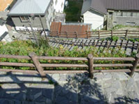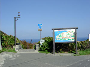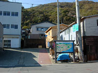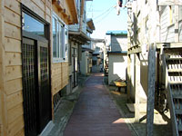 | 高低差約70メートル,361段という険しい道のり。 | この道も国道。風が強いので非常に狭い通りに正面を向けて家が建っている。 | 漁港側の階段国道入口。 |