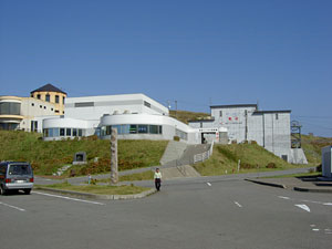 左から東北電力の竜飛ウィンドパーク,青函トンネル記念館,竜飛斜坑記念館駅。青函トンネル記念館は「道の駅みんまや」にも指定されている。屋外にはトンネル工事に使われた機械の展示スペースもある。