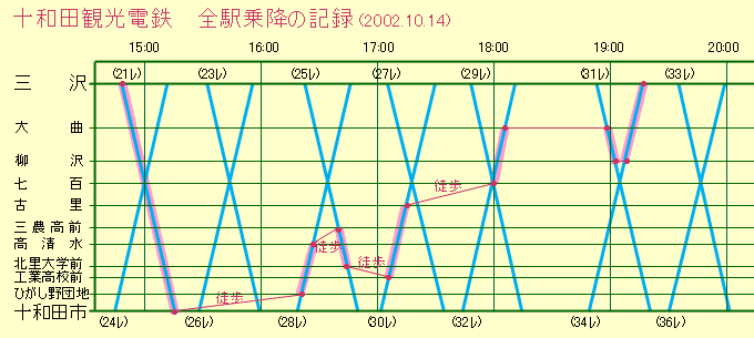 本数の少ないローカル線でどうやって駅に乗り降りしているのかと不思議に思われることがよくある。よい機会なので,ここで全駅乗降の方法について説明したい。下に十和田観光電鉄のダイヤと,実際に移動した行程を示す。