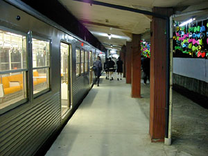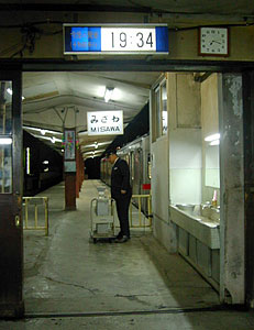 ![]() 三沢駅では全部のドアが開く。ワンマン運転のため,他の駅では前乗り前降り。 |