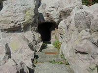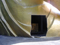 | 涅槃像内部。涅槃像は巨大な張りぼてだったのだ。外皮は恐らく金属ではなく石油化学系の材料で作られている。鉄骨部分も腐食が激しく,このまま放置すれば近い将来,崩壊が始まるだろう。 | 涅槃像の脇にある岩もきゃしゃな張りぼてで,中には配管設備が収まっていた。 |