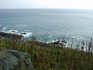 汐首岬−大間岬は北海道と本州が最も接近する地点で,お互い17kmしか離れていない。津軽海峡を横切る船が仮に海峡の真ん中を通ったとしても陸から8kmしか離れていない。だから海峡を行く船がすぐそこに見える。第2次世界大戦中はここに要塞が置かれ砲台が築かれたという。