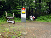 鶴の湯入口で1組の夫婦が降りようとした。すると運転士さんは「ここからはかなり距離がありますよ。旧道口から歩いたほうが近いですよ。山道ですが道はついてます」と助言していた。どうやら旧道口から行けそうである。その夫婦と一緒に旧道口でバスを降りた。