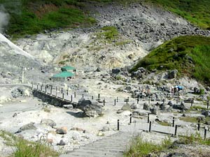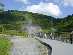 温泉の周辺には登別の地獄谷のような噴気孔がある。1周1kmの自然研究路が設けられているので,明るいうちに歩いてみる。