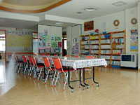 国道からちょっと入ったところにある,しゃれた校舎の小学校。校舎中央のロビーには14人が座れるテーブルがあった。給食はここに先生・児童がみんな集まって食べるのだろう。賑やかな光景が想像できる。