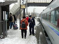 トマム到着。車掌さんが集札をし,赤い服を着たリゾートの係員が案内してくれる。