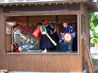 太鼓をはたくのはかなり高齢のおじいさんである。太鼓のひもを肩にかけようとするのだが,それにも四苦八苦している。観客から「手伝ってあげたら」とか声が飛んだが,「好きなようにやらしてやれ」と制止する人もおり,おじいさんはマイペースでゆっくりと仕度をする。