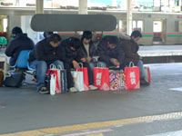 ホームでは少年たちが福袋の中身を興味津々とのぞいている。しかし初売りは本来2日のはず。元旦の朝から福袋とは少々せわしない。