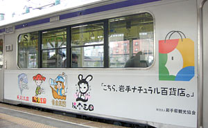 車体には岩手県各エリアのロゴタイプと絵が描かれていた。「こちら,岩手ナチュラル百貨店。」とは北海道のお株を取られてしまったようなキャッチフレーズ。それぞれの絵もかわいらしくて好ましい。