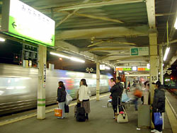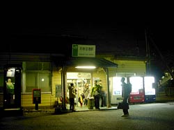 花巻空港駅着。写真右手に茫然として駅名板を眺めている青年が見える。このあとわたしは彼に「花巻空港へはどう行ったらいいのですか?」と聞かれた。とりあえず「歩いて30分ぐらいで着きます」と答えておいた。