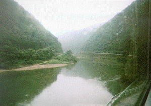 | 江津駅にて。この列車でいよいよ中国山地を横断します。真ん中に写っているおじいさんと1時間半ほど話をしました。島根はいいです。 | 中国地方最大の河川,江の川。三江線はひたすらこの川に沿って走ります。竹林が道民の私には新鮮でした。 |