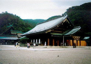 | 出雲大社。タクシーの運転手さんもお勧めしていたアングルです。私としては珍しく,賽銭(45円)を入れ,ご縁があるように4回手をたたきました。 | 廃止になった国鉄の旧大社駅。出雲大社には一畑電鉄のほうが近く廃止になったのもうなずけます。しかしこちらのほうが風格十分,大きなホールが印象的。賑わっていたころのようすがめに浮かんできました。 |